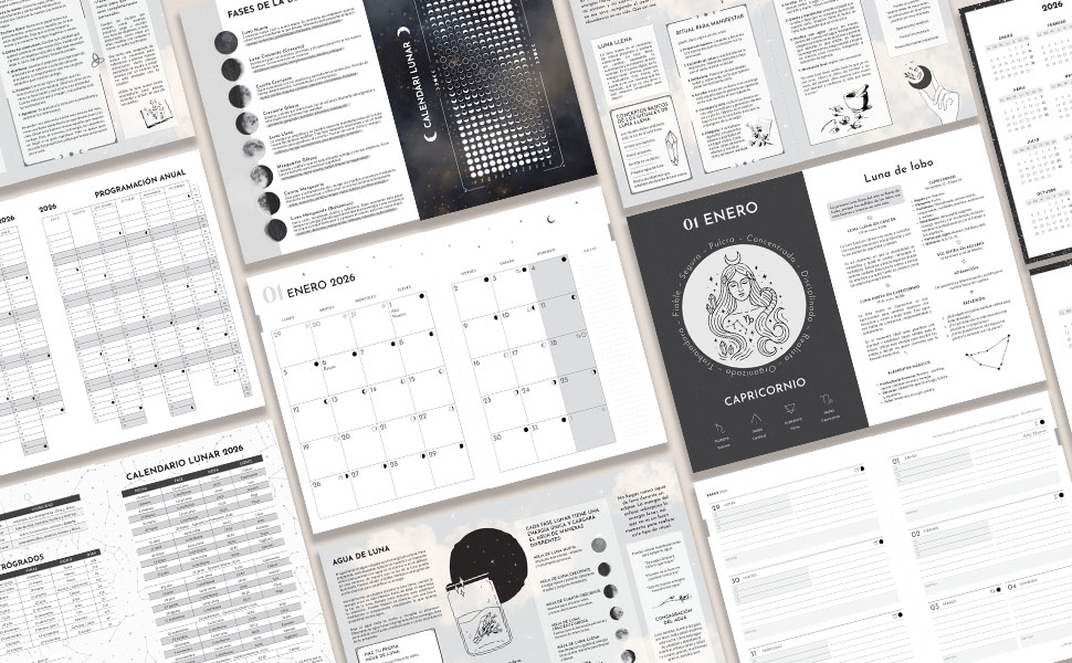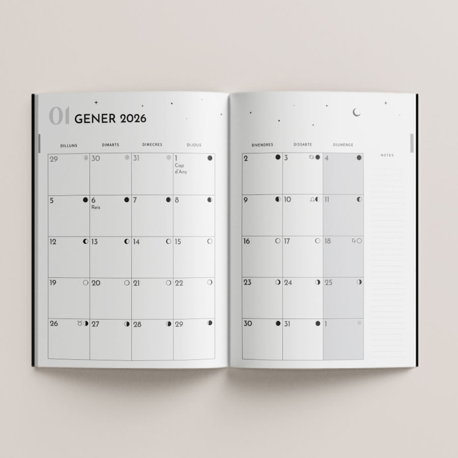 No necessites saber sobre astrologia per aprofitar aquesta agenda, t’expliquem que significa cada fase de la lluna, et donem rituals fàcils i cada mes expliquem els esdeveniments més importants perquè et planifiquis sincronitzant-te amb la lluna.