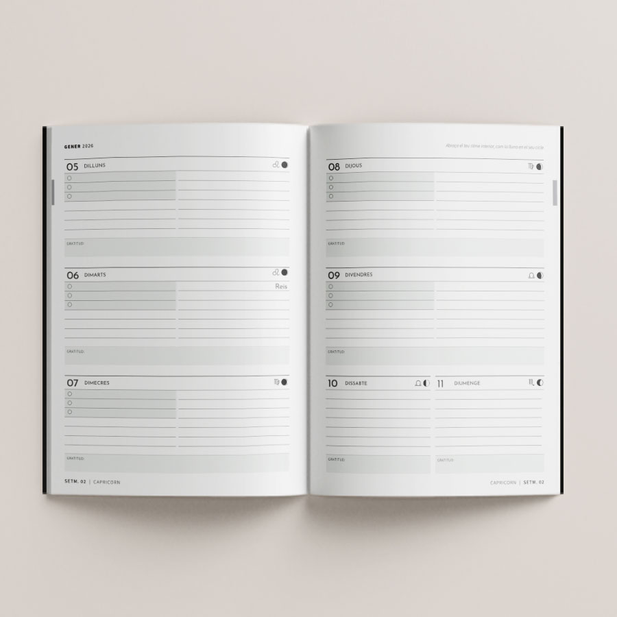 Aquesta agenda lunar és un planificador que utilitza les fases de la lluna per ajudar a organitzar-te d’una manera simple i pràctica perquè puguis aprofitar les energies naturals de l’univers.