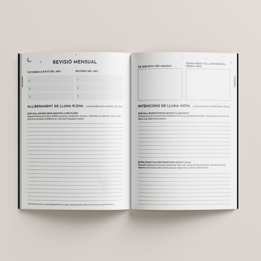La revisió inclou reflexions per la lluna nova i la lluna plena per completar cada energia dintre del mes.